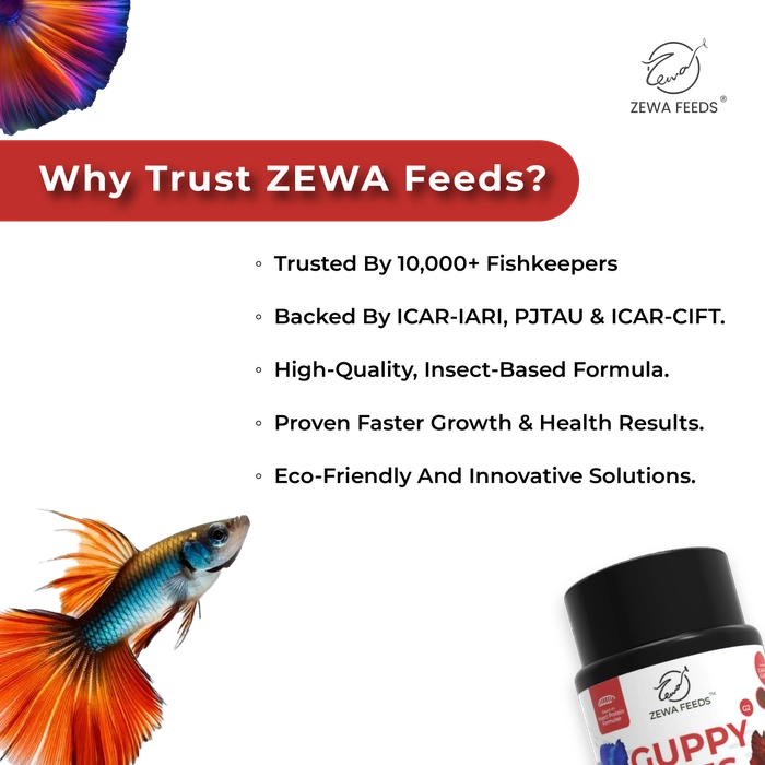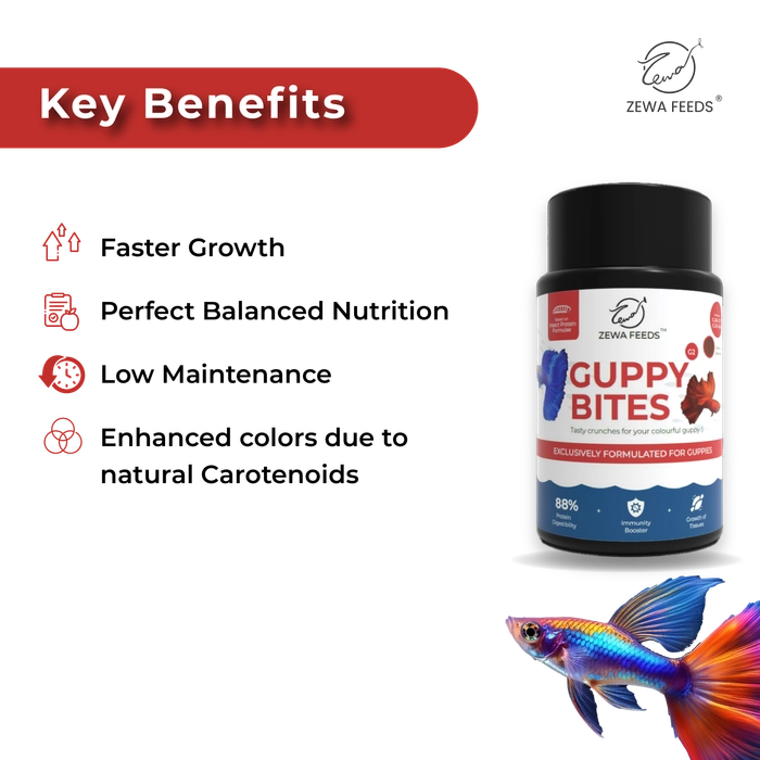 Advanced Guppy bites: Tailored nutrition for healthy guppy fishes. A mix of insect protein and spirulina gives the best feed possible to boost energy and immunity levels. Formulated for the overall health and maximum digestion. Guppy bites are the perfect treat for your beloved aquarium fish. These bite-sized morsels are specially formulated to provide a balanced and nutritious diet for your guppies. Made from high-quality ingredients, guppy bites are rich in proteins, vitamins, and minerals essential for the growth and overall well-being of your guppies. These tasty treats sink slowly, ensuring that your fish can enjoy them at their own pace. Guppy bites are easy to digest and help maintain a healthy digestive system. Whether you have fancy guppies or regular ones, these bites will keep them active, vibrant, and in top condition. Suitable for both adult and juvenile guppies, these bites can be given as a primary food or as a supplement to their regular diet. With their irresistible flavour and aroma, your guppies will eagerly gobble them up, making feeding time a delightful experience. Keep your aquatic friends happy and healthy with these delectable guppy bites.